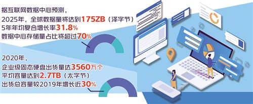 当前,全球正进入数字经济时代,各种大、中、小型数据中心已经成为数字经济的基础设施。大量新技术新商业应用将催生出对边缘计算和数据中心的海量需求。据互联网数据中心(IDC)预测,2025年,全球数据量将达到175ZB(泽字节),5年年均复合增长率31.8%,而数据中心存储量占比将超过70%。作为数据中心越来越重要的存储介质,企业级固态硬盘在2020年出货量达到3560万个,平均容量达到2.7TB(太字节),出货总容量较2019年增长近30%。