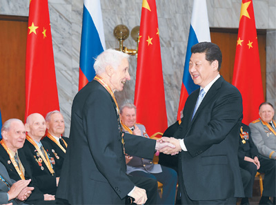 2015年5月8日,习近平在莫斯科会见曾在中国东北抗日战场上和卫国战争中浴血奋战的18名俄罗斯老战士代表。习近平同老战士代表们一一握手,向他们致以亲切问候,并颁发了纪念奖章。当年迈的老战士加维尔托夫斯基起身接受奖章时,习近平看到他年事已高,腿脚不便,马上说:“我过去给你颁奖,你别过来了。”习近平快步走到老人身边,为他佩戴上了纪念奖章。全场对此报以热烈的掌声。